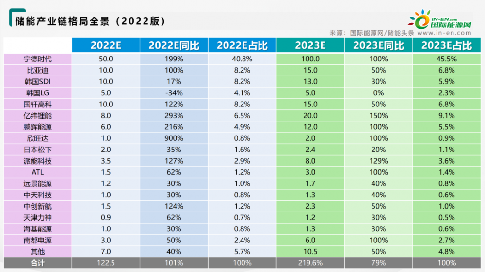 According to the calculation, the global energy storage cell shipment is expected to be 122.5/219.6GWh from 2022 to 2023, with an increase of 101%/79%. Among them, Ningde Times occupies the top spot as the largest cell supplier. It is expected to ship 50/100GWh in 2022-2023, with the same increase of 199%/100%, accounting for 40.8%/45.5%, and its leading position is stable.